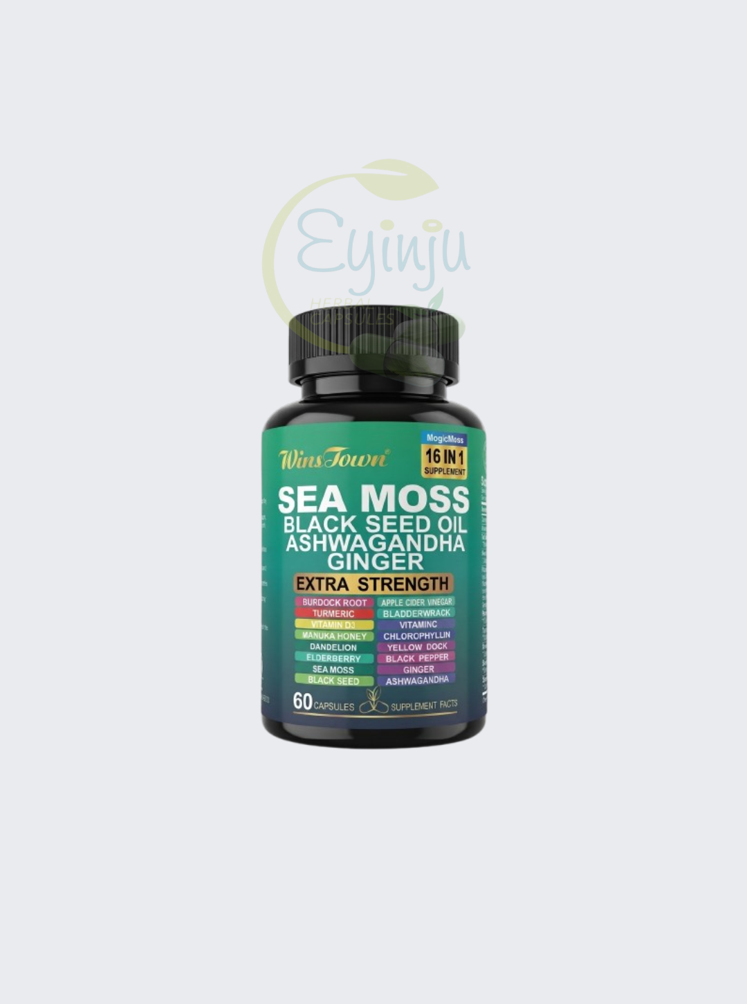 WinsTown 16-in-1 Extra Strength Sea Moss Complex (60 Capsules) A powerful all-in-one wellness formula combining Sea Moss, Black Seed Oil, Ashwagandha, and Ginger. Designed for maximum potency, these capsules support immune health, thyroid function, and natural energy levels with 16 nutrient-dense ingredients.